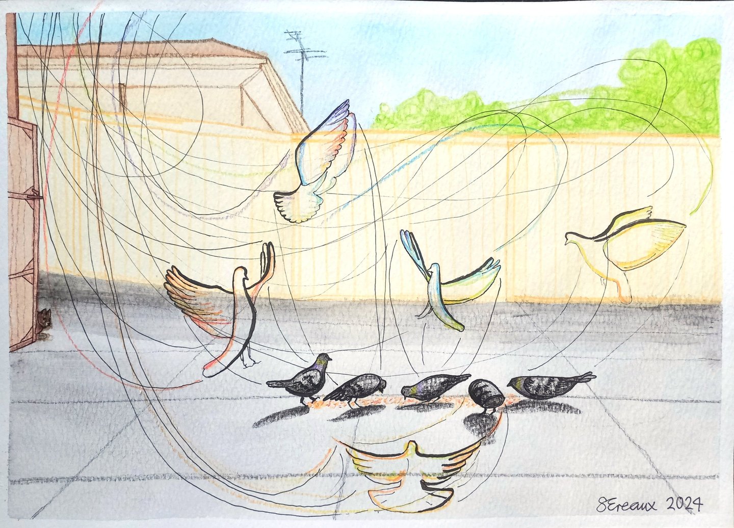 I loved creating this image. It was a challenge mentally, technically and artistically. Mentally, there was a fair amount of planning involved to video the daily pigeon feeding, and choose still-frames to draw, and to get the layers of the image right.