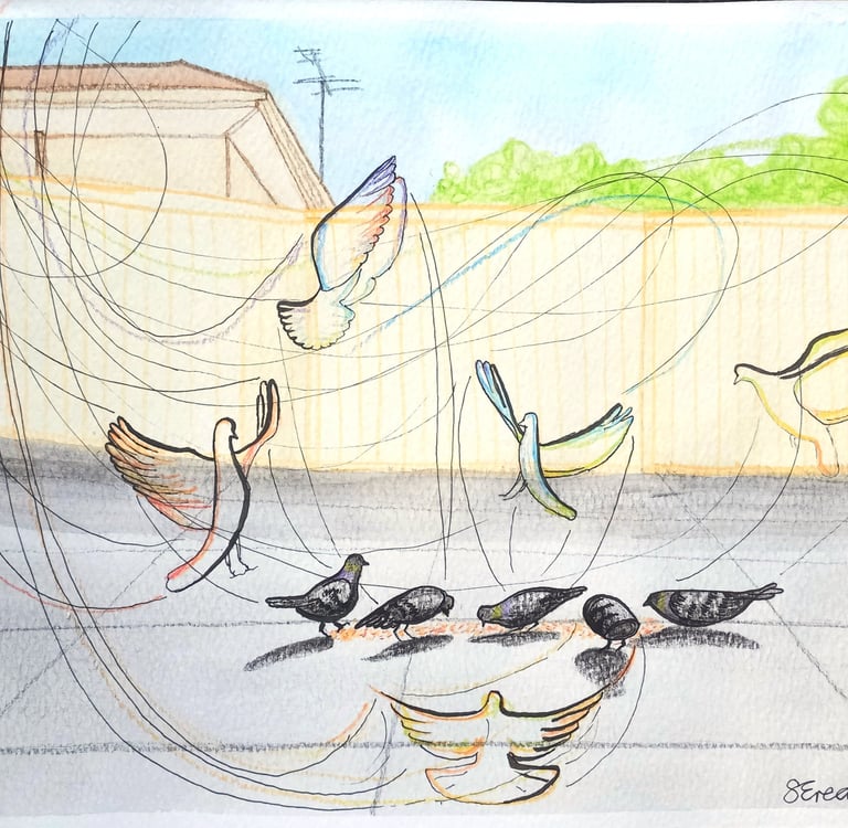 Spurred on by a competition and the offer of a prize, I created this artwork, quite different from my usual content. I loved capturing the pigeons in flight.