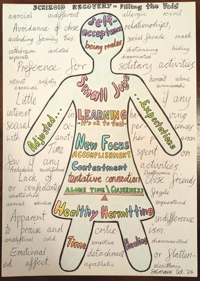 So, here you'll find my 'Schizoid Recovery - Filling the Void' artwork (below), and my ProjectAir conference slides. You might also like to check out and share the short video I made for Youtube: "What it’s really like to have Schizoid Personality Disorder" .